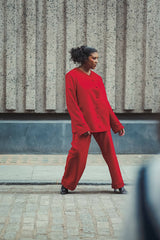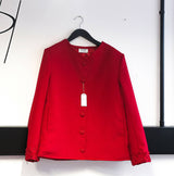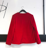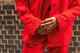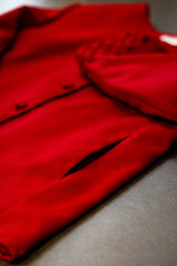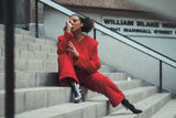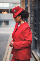 Made from 100% fine wool. An original, one-off, and lined repurposed Sarah Hollebon jacket incorporates hand woven boucle in the cuffs. Hand finished side pockets, for that clean, sleek, look. The buttons are hand covered, with professional key hole button holes. This unique jacket holds a message of mental well-being. Sleek, clean lines contrasted with the raw woven technique on the suit, shows us we are all a work in progress as we navigate and discover life’s ebb and flow. Jacket size in CM - Bust: 130 Waist: 134 Hips: 134 Sleeve length: 69 Shoulder seam: 14.5 Garment length: 66