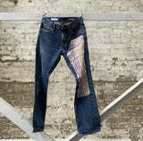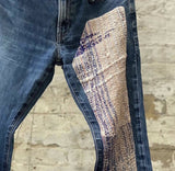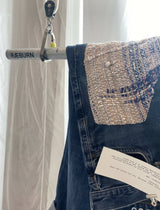 Send us your pair of trousers, we select the best weaved piece with a similar thickness and the result will be unique. Weaved by Janine from Freeweaver Saori Studio based also in East London like us. We are studio neighbors :)This is not a patch, it is even better! It doesn't go on top of the trousers, instead we cut the garment so it becomes one sharing the same layer.Let us know which colors and size you prefer; we will contact you after the purchase trough email so we can select together the size, placement, colors and composition of the weaving as closest as we can to your wishes ;)As this is a zero waste production we only sell the service: you send us trough mail your garment and we make the design on it. After two weeks you have it back ready to wear!You can make this amazing reworking in all kind of garments, check the rest of the options we have :)